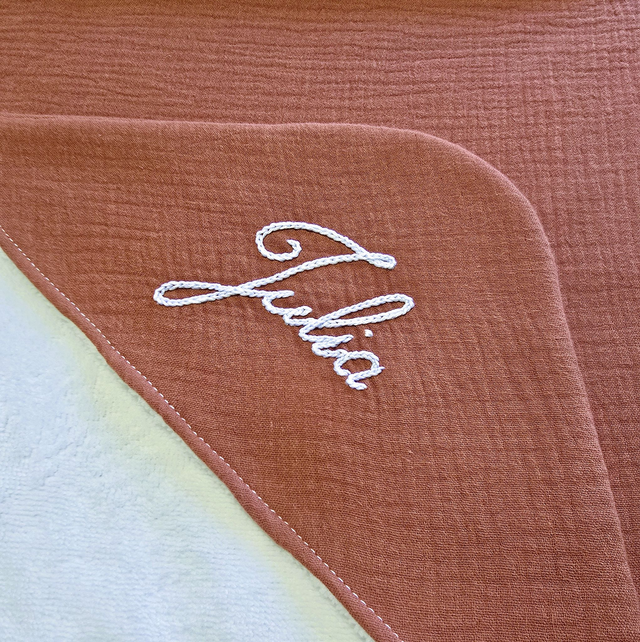 Si vous choisissez l'option "prénom de l'enfant brodé" (broderie à la main), veuillez indiquer le prénom de votre enfant dans la case "Message à l'attention du commerçant" sur la page de paiement.