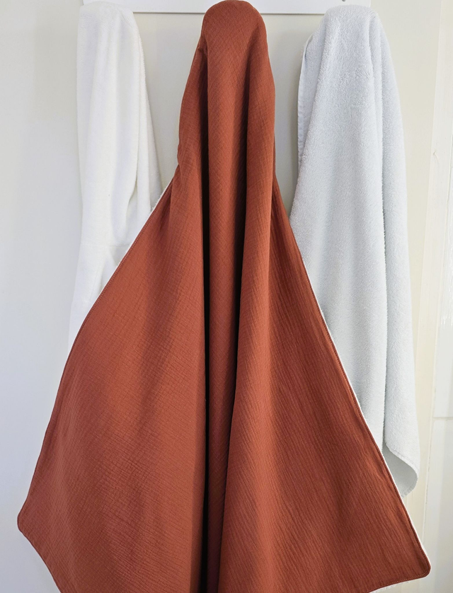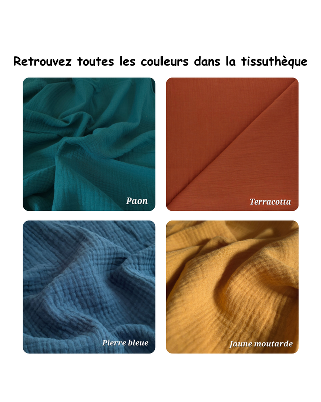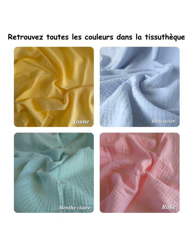 Rendez-vous sur la page de la tissuthèque ici afin de choisir la couleur de votre cape de bain dans la catégorie "double gaze unie". Les tissus utilisés sont certifiés Oeko-tex, c’est à dire qu’ils sont garantis sans substances nocives pour la santé.